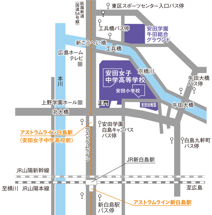 「白島駅」「新白島駅」のすぐ近く。JR ・アストラムライン・バスで安心通学。