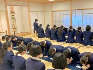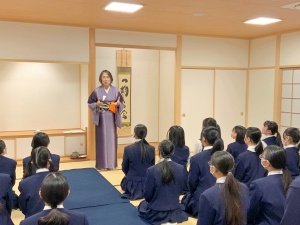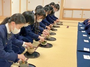 2026.01.23中学2年生の総合学習として、茶道体験をしました。表千家の先生にご指導いただきながら、お茶室でクラスメイトのためにお茶を点て、また、お菓子とお抹茶をいただきました。相手を思い、もてなすという茶道の心に触れる貴重な時間となりました。