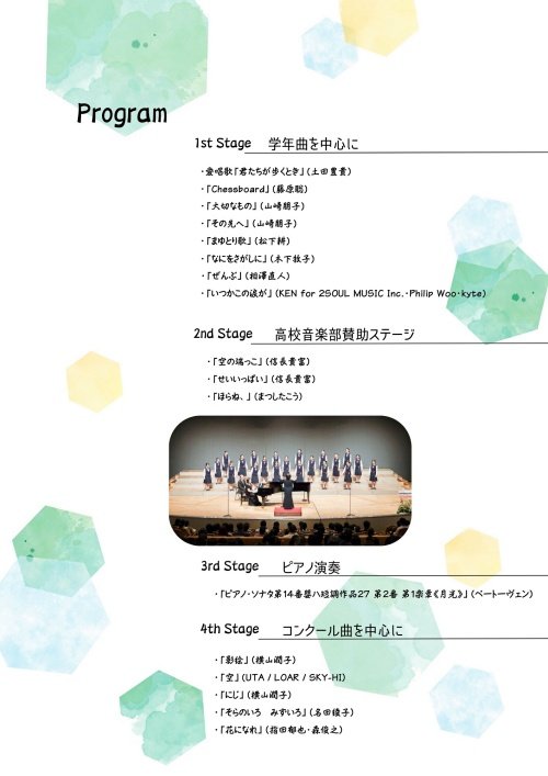 今年度のコンクールやコンテストで演奏した曲をはじめ、学年ごとのステージなど、日頃の活動の成果を発表します。その他、ピアノ演奏などもあり、内容盛りだくさんでお届けします。みなさまのご来場を心よりお待ちしております♪
