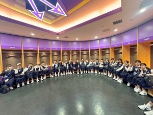 2026.04.201学年は「エディオンピースウィング広島」のスタジアム見学と校内レクリエーションを行いました。見学では選手のロッカールームやVIPルームにも入ることができ、貴重な体験となりました。レクリエーションでは「ジャンボリミッキー!」を全員で踊り、楽しい時間を過ごしました。