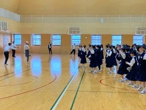 1学年は「エディオンピースウィング広島」のスタジアム見学と校内レクリエーションを行いました。見学では選手のロッカールームやVIPルームにも入ることができ、貴重な体験となりました。レクリエーションでは「ジャンボリミッキー!」を全員で踊り、楽しい時間を過ごしました。