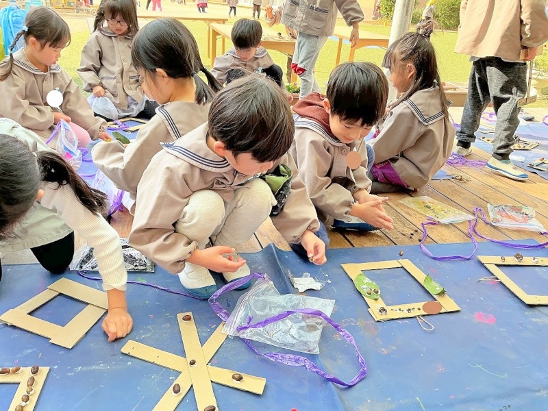 散歩や家の周りで見つけた自然物をみんなで集めていました☆ 事前に段ボールを組み合わせて枠を作っていました。 今日はそのダンボールに思い思いにデザインし、自然物を貼りま…
