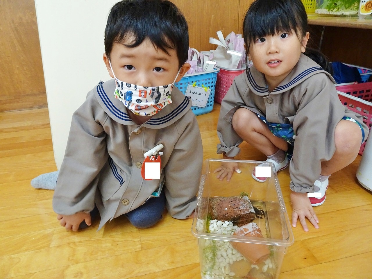 クラスで飼育しているザリガニが脱皮をしていました。そのことに気付いた子どもたちが、「え!?ザリガニふえたの!?」と、驚いてましたが、よく見ると、赤い方は抜け殻! 「すごいねー!」「だっぴ??」大きくなると”脱皮”をすることを知り、不思議そうな子どもたちでした。