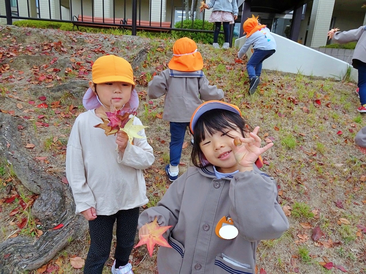 「はっぱのいろがかわってる!」「あかとオレンジのはっぱだあ!」「きいろとオレンジのはっぱもあるね!!」と、前回行ったときよりも、秋が深まり、紅葉した様子を沢山見つけていました。