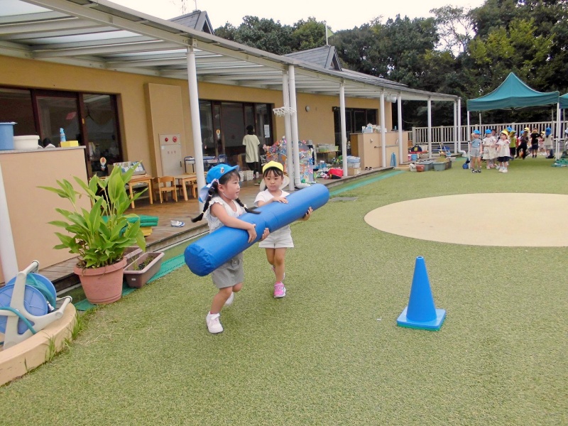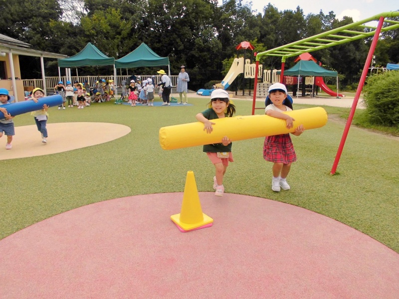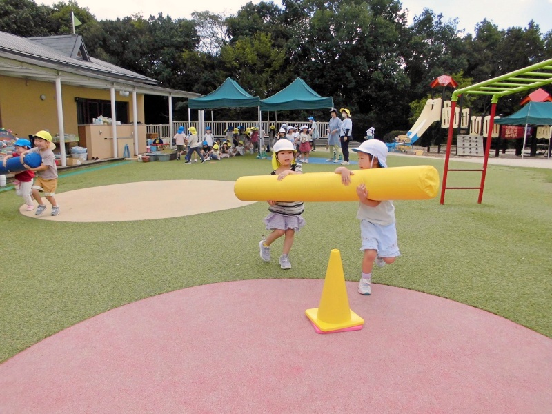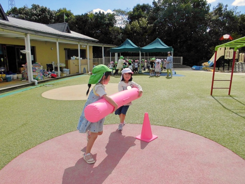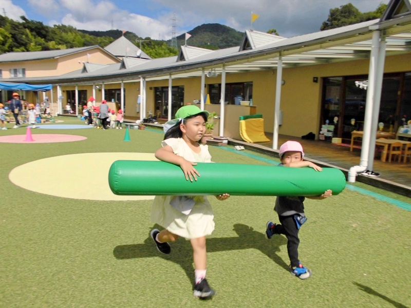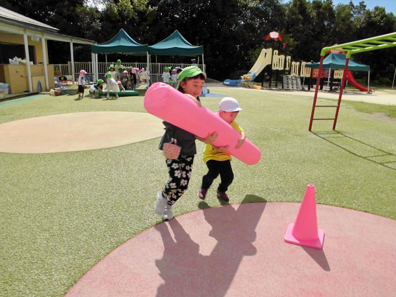 自分の背より大きいバトンを、年中組と年長組が一緒に運ぶゲームです。