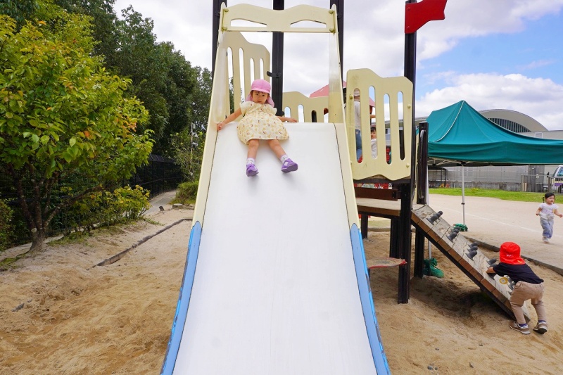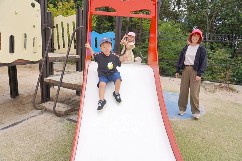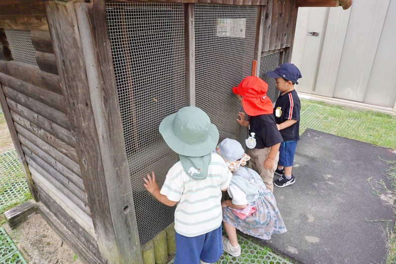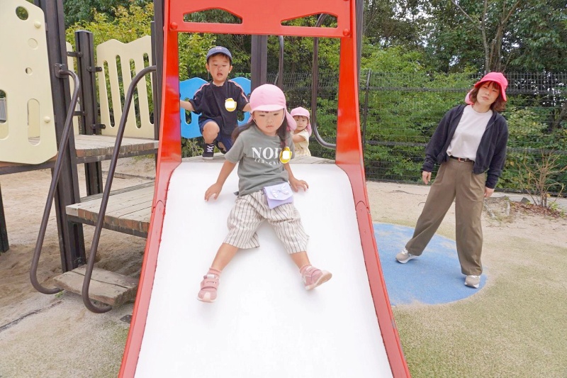 うさぎ小屋をのぞいたり、園庭のブランコや砂場、滑り台でたくさん遊んだりしました。