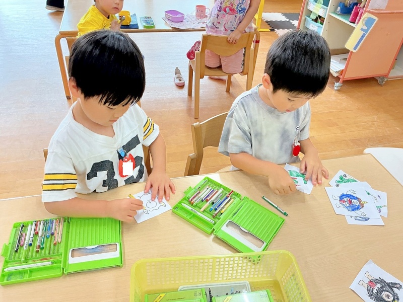 「かっこいいモンスターにしよう!」「緑で塗るのはどう?」など、思い思いにモンスターを塗ることを楽しんでいます♪