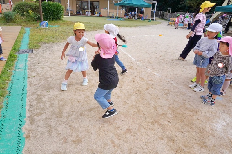 ピンクと黄色の帽子は年中児です!!年長児に教えてもらいながらリレーを楽しみました。