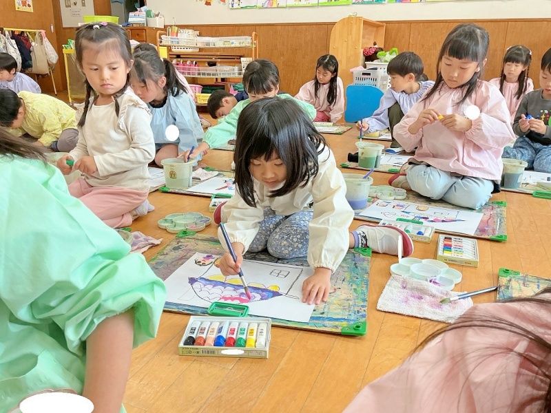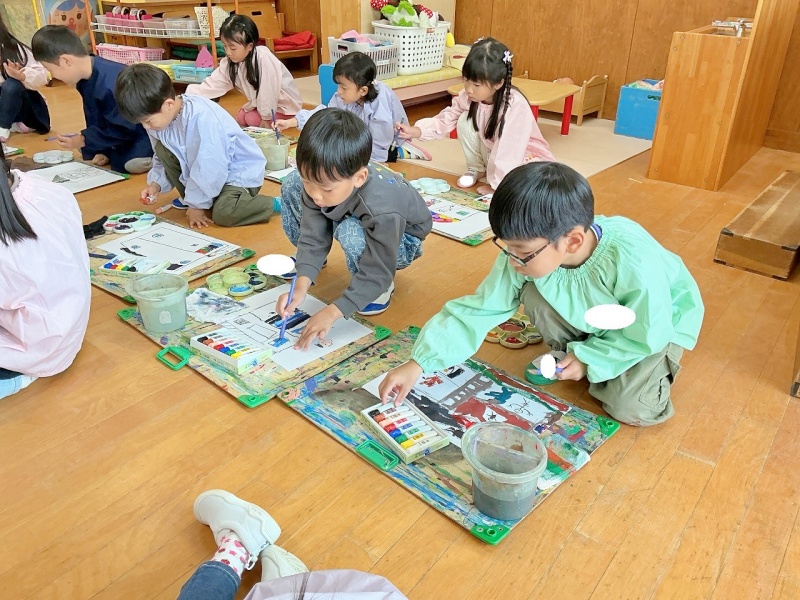 年長組では、個人絵具を使って絵具遊びをしました。「あかとあおをまぜて・・・」「わあ!きれいないろができた!!」など、色をつくったりぬったりすることを楽しみました(^^)