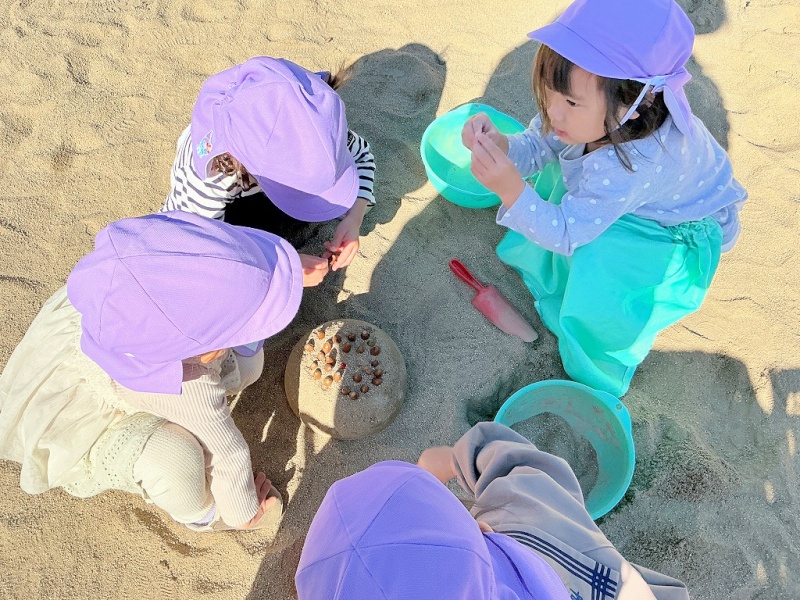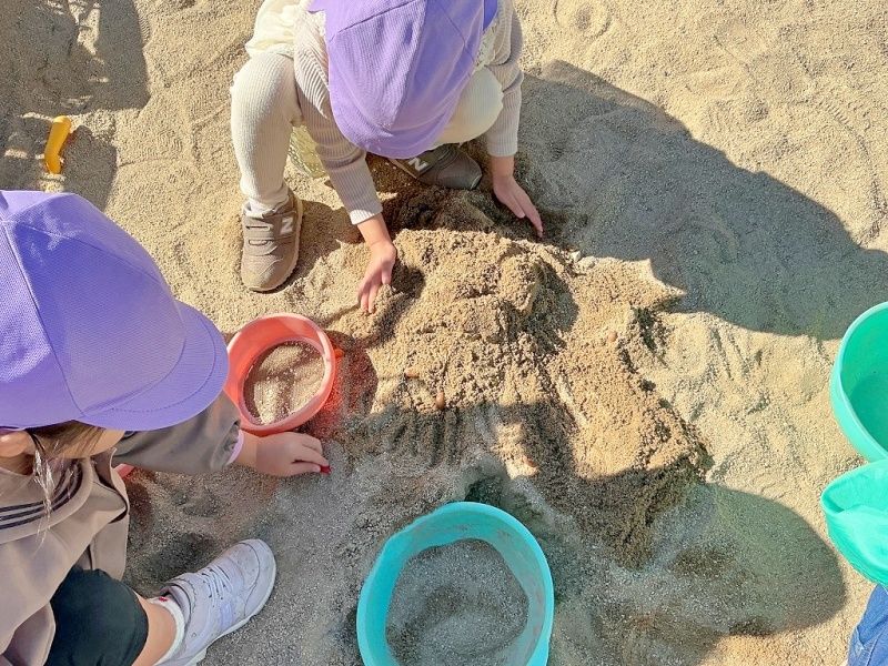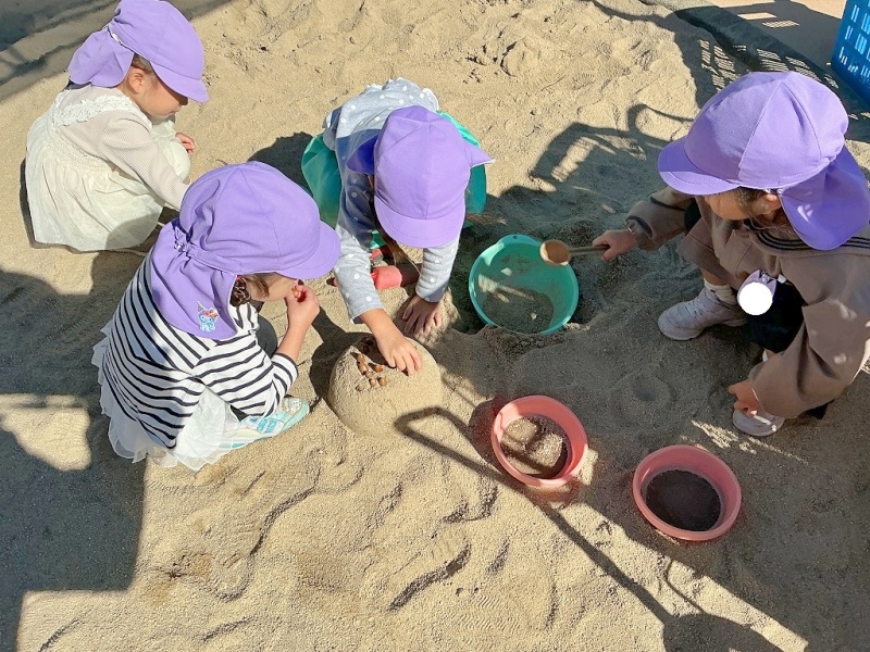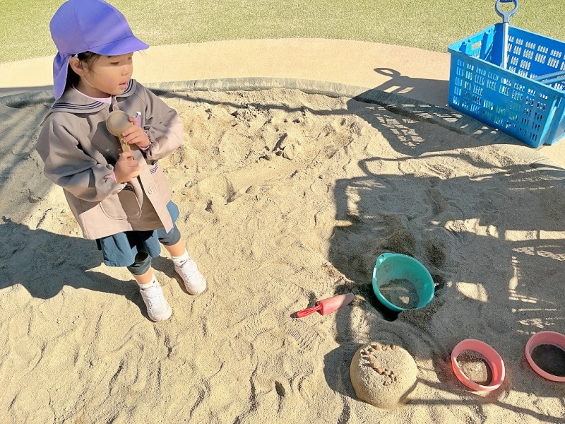年少ぞう組の女の子が「ケーキつくろう!」と砂場にやってきました!