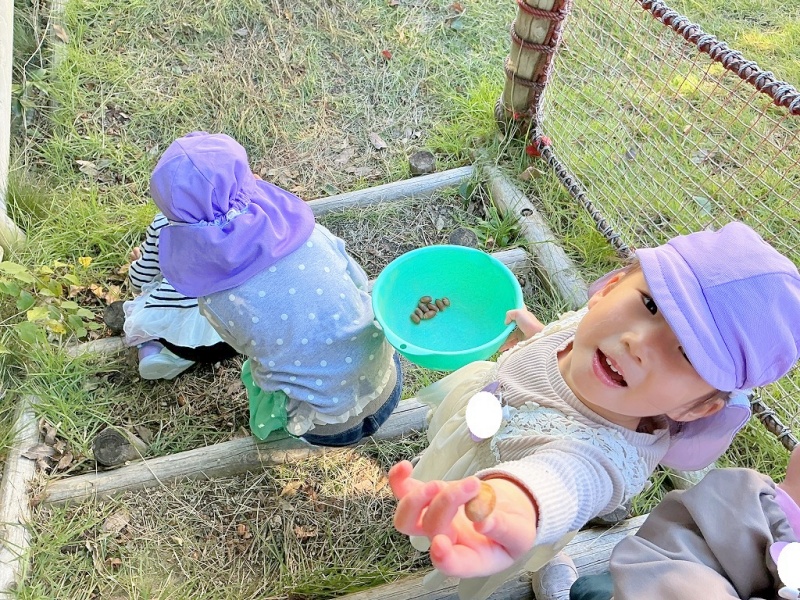 幼稚園ではたくさんどんぐりが落ちているので、それを集めることに(^.^)