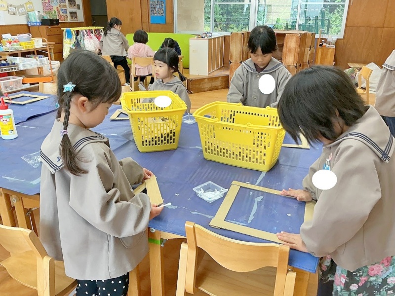 年長組では秋の宝物を探しています。みんなでみつけて集めたり飾ったりしています。
