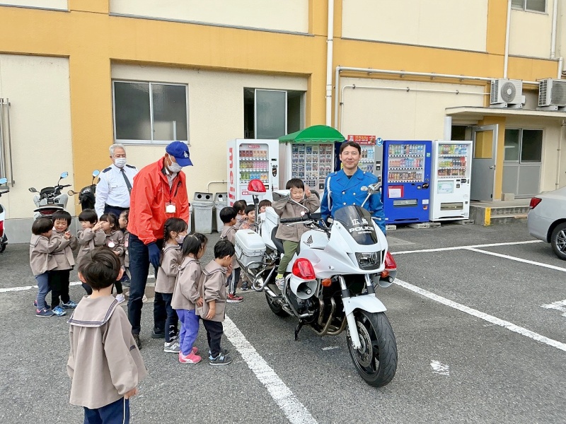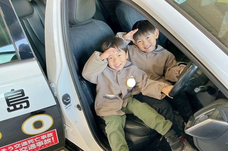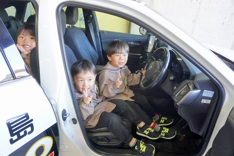 パトカーや白バイに乗せてもらったり、交通安全の勉強をしたりしました。かっこよくて優しい警察官の方に、「これなに?」とたくさん質問をしていました。もちろん、園を代表して「ありがとう」の気持ちとお手紙を届けました。