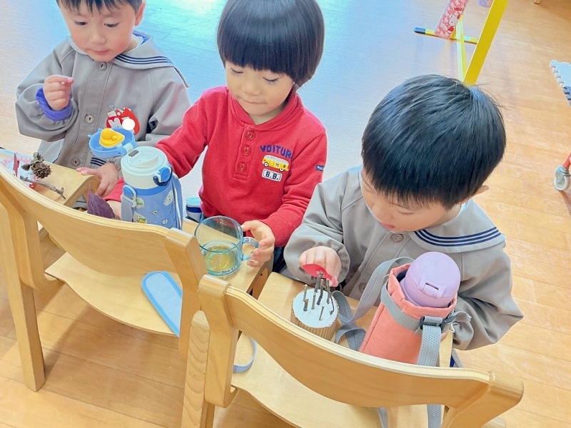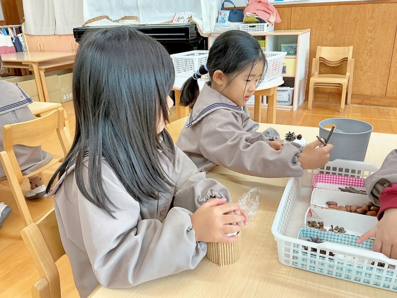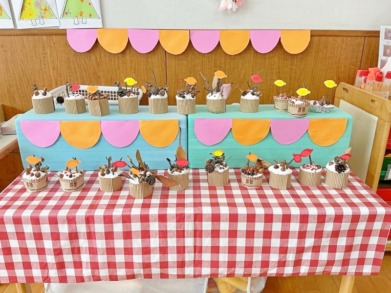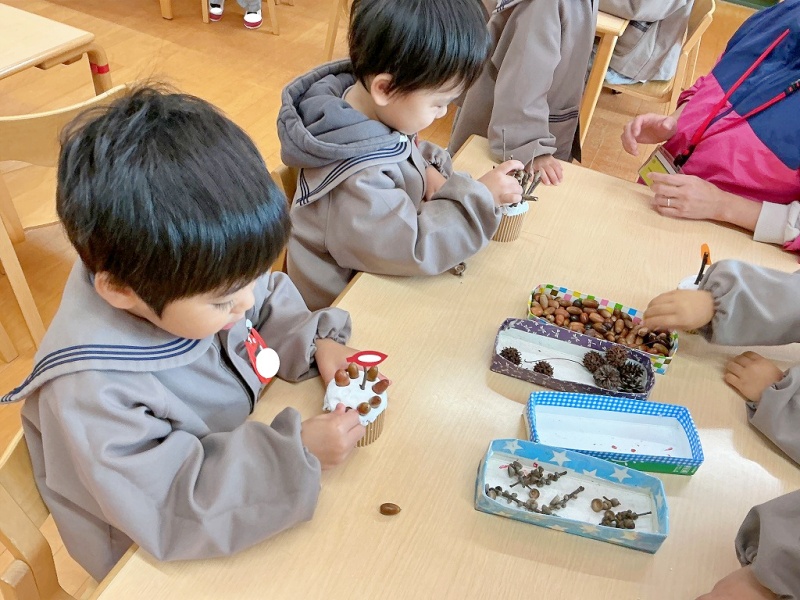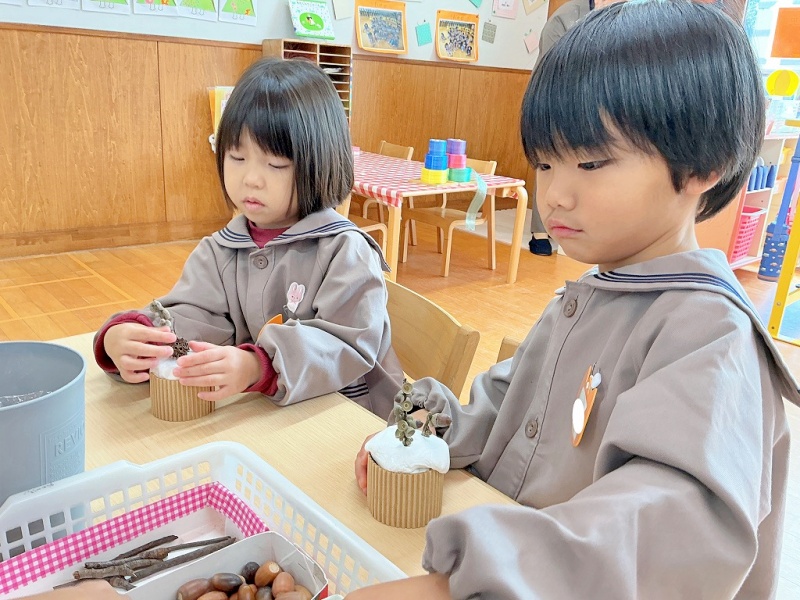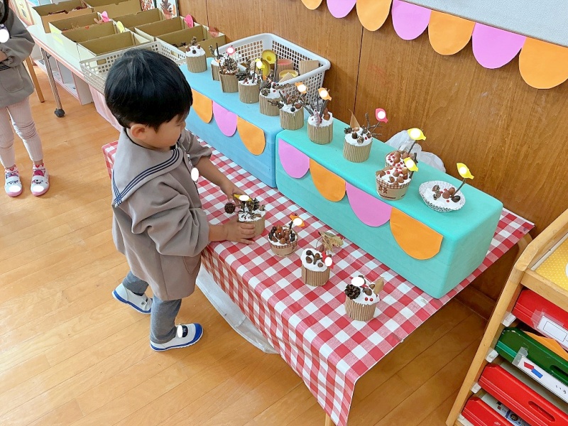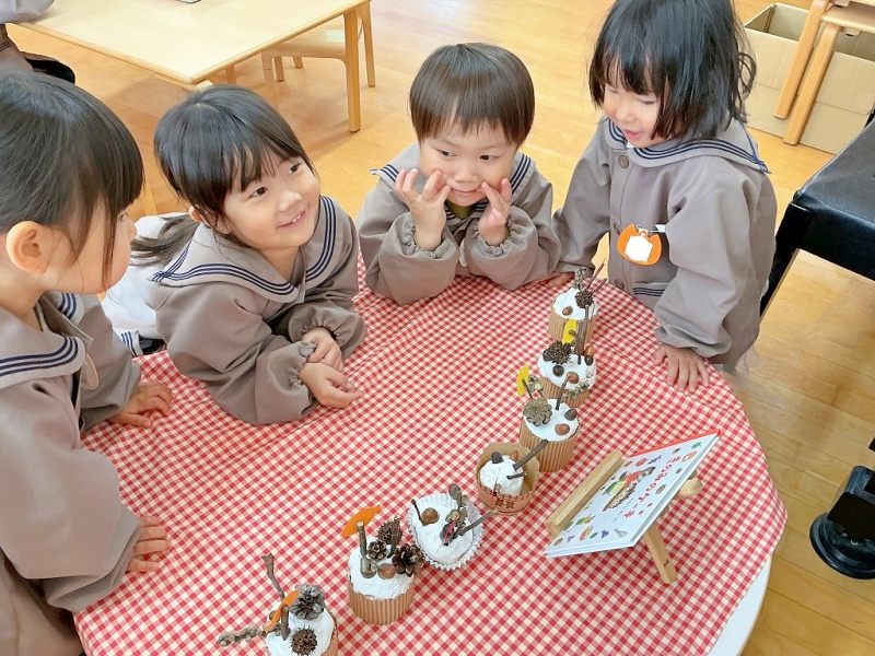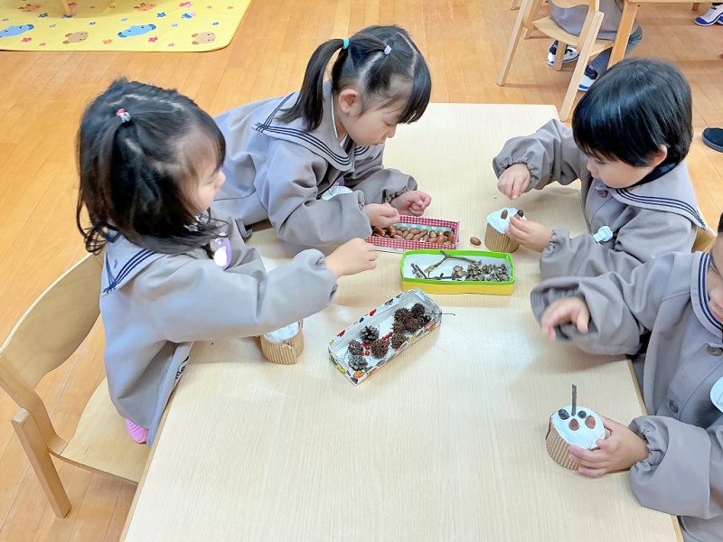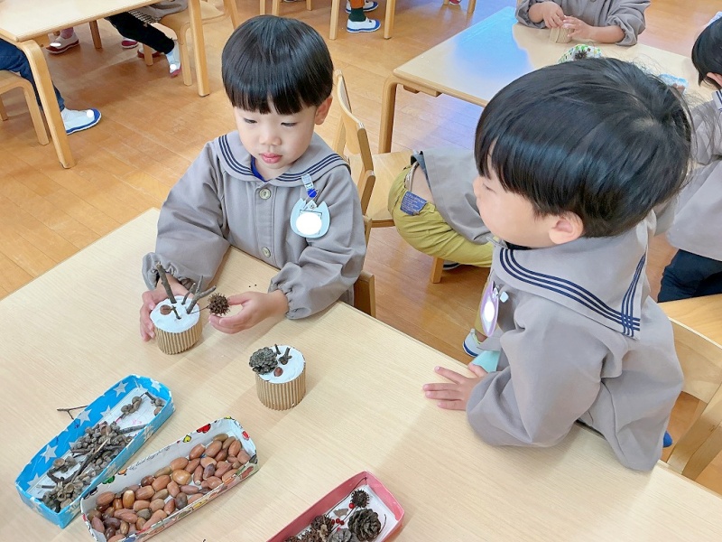 年少組では、これまでに散歩で見つけたどんぐりやどんぐり帽子、葉っぱ、木の枝などを使ってどんぐりケーキを作りました!