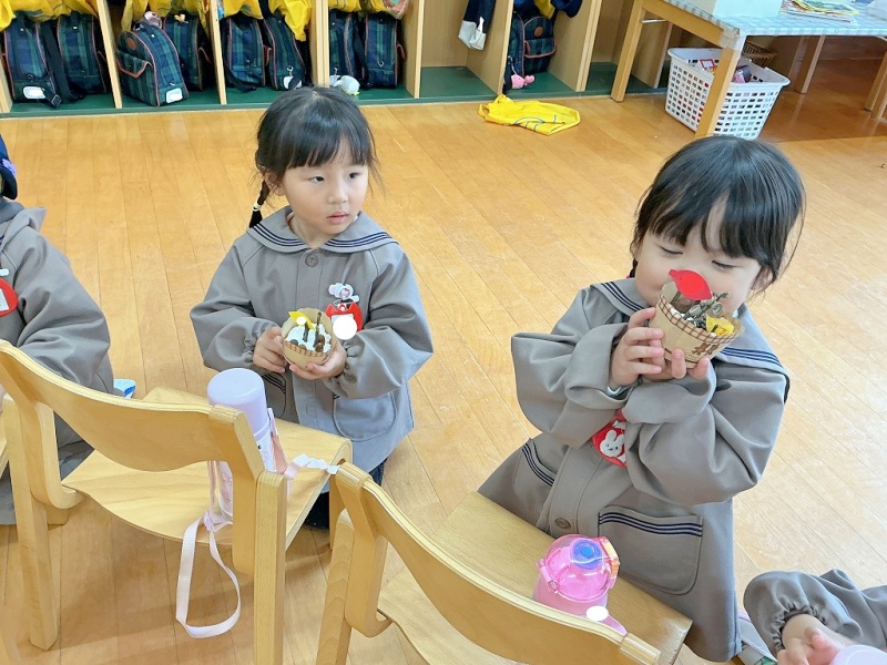 完成したケーキをケーキ屋さんみたいに並べたり、食べる真似っこをしたりして楽しみました♡