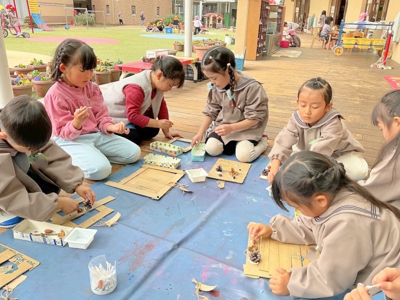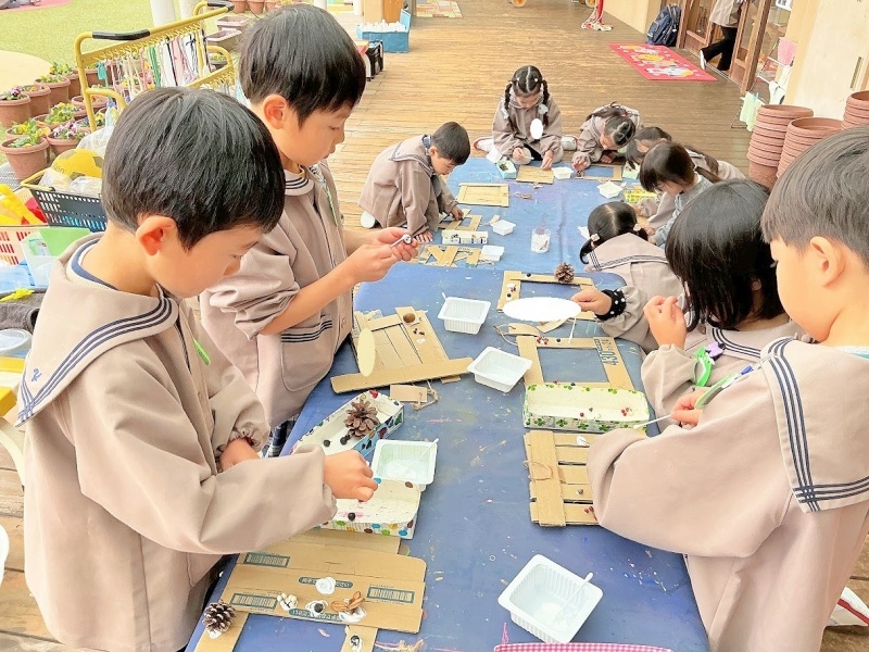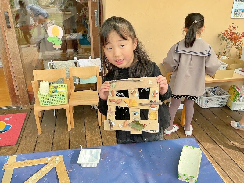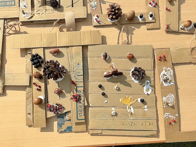 今日はそのダンボールに思い思いにデザインし、自然物を貼りました☆★