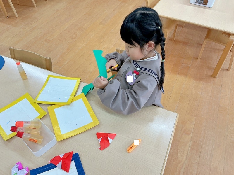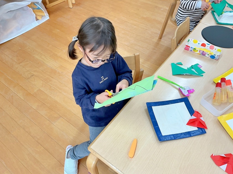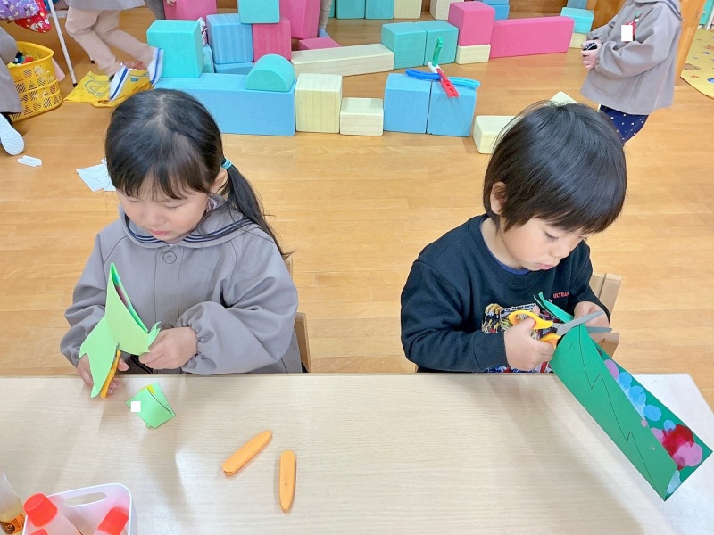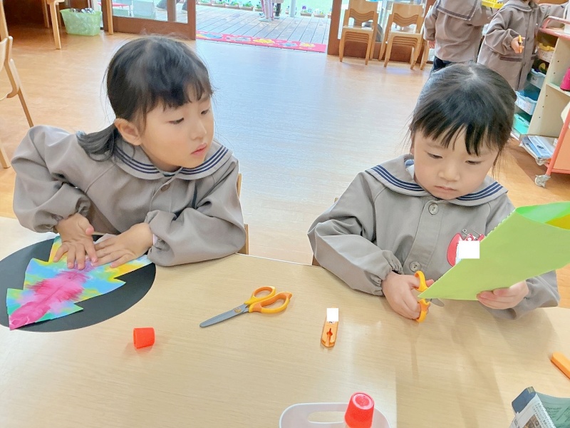 年少組では、昨日、デカルコマニーをして遊んだ画用紙を線に沿って切って…