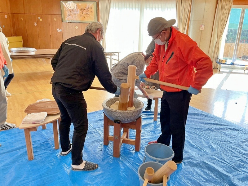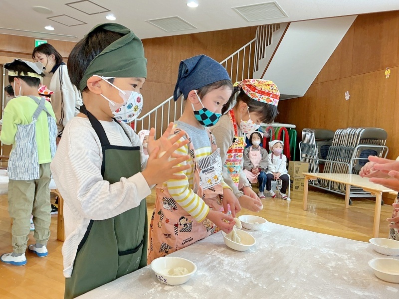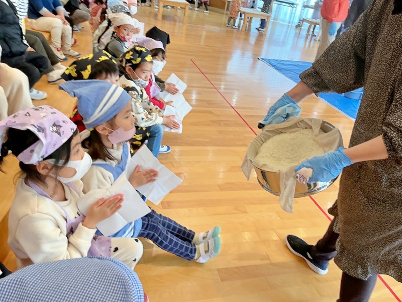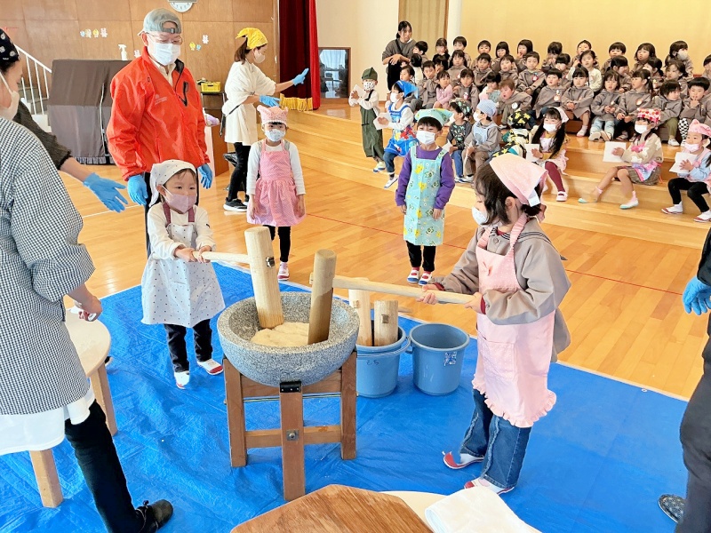 幼稚園の田んぼで田植えや稲刈りをしたもち米を使って、年長組がお餅つきをしました☆