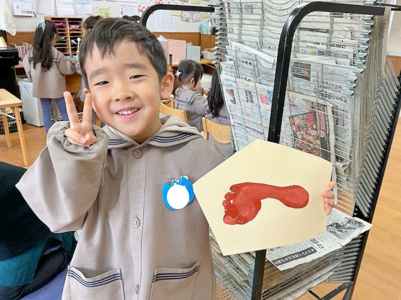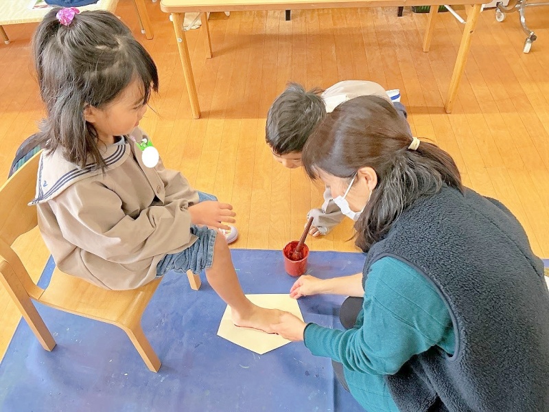 年長組では、絵馬の形をした画用紙の上に足の形をスタンピング!(一人一人の足の形が違い、とても可愛かったです♡) 何に見えますか???また後日、お楽しみに・・・♡