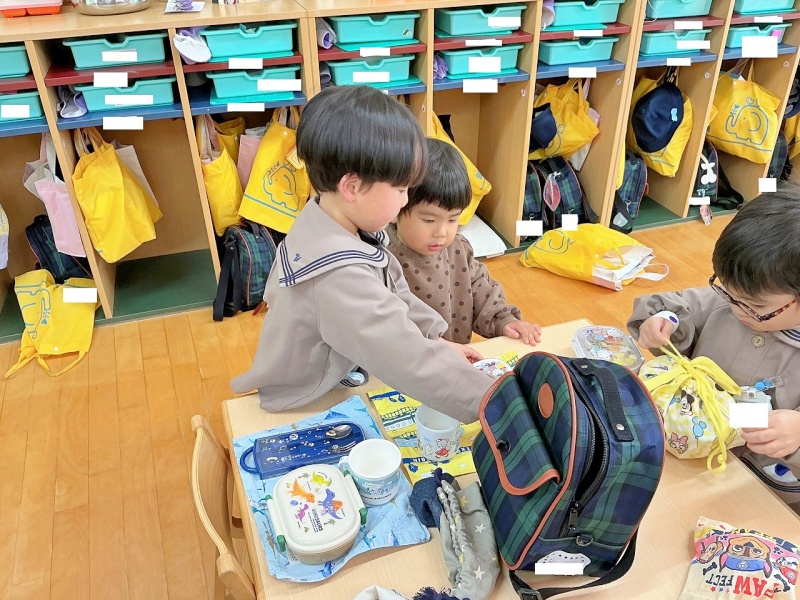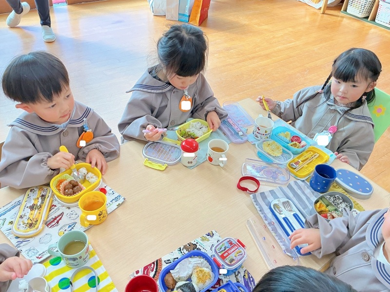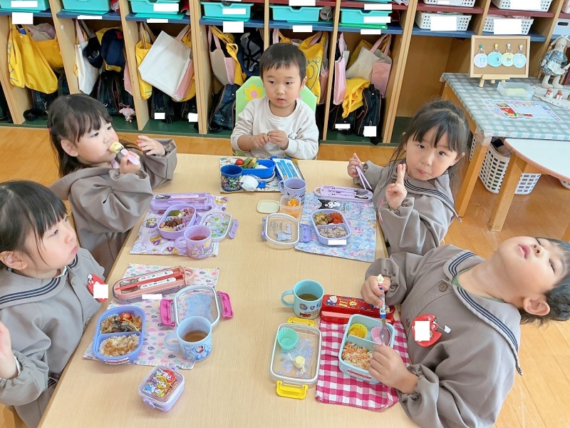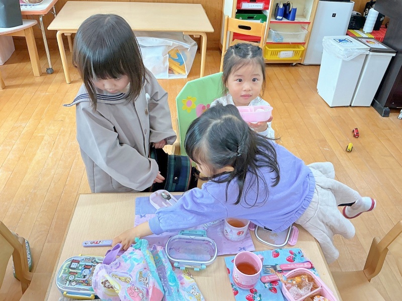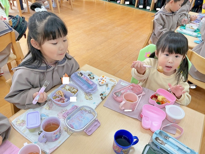 今日はひよこ組の子どもたちが年少組の部屋に来てくれて、一緒にお弁当を食べました!