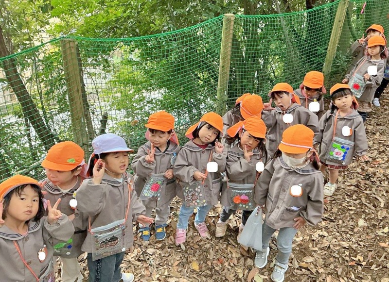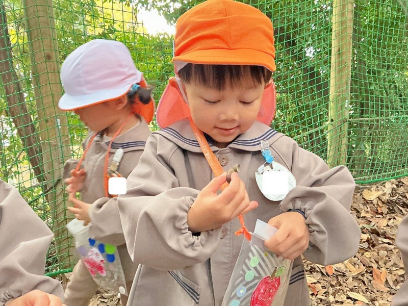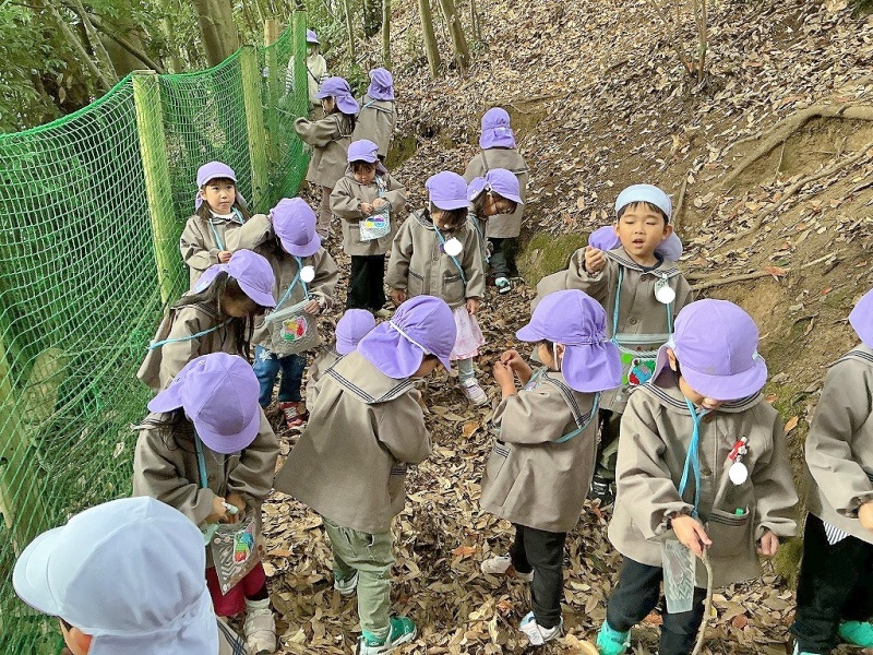 年少組の子どもたちが、手作りのバッグを持ってどんぐり探しに探索道に行きました(*^^*)