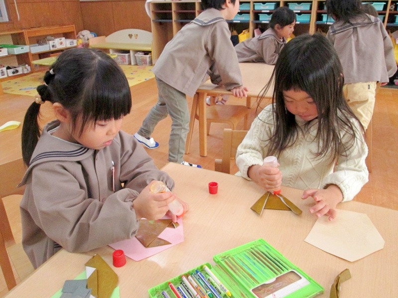 折り紙で馬を折って、周りには好きな模様を描いたり、シールを貼ったりしました。