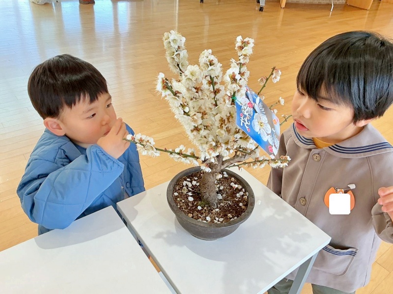 リヨウ先生が好きな白梅も園に飾ってあり、「甘いにおいがすきなんかね」と白梅に鼻を近づける様子も見られました。
