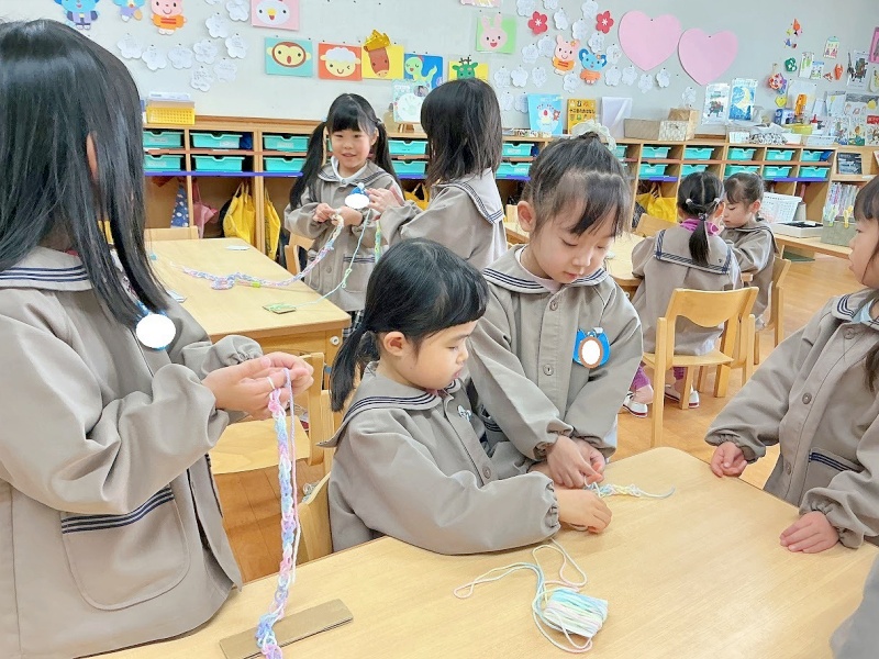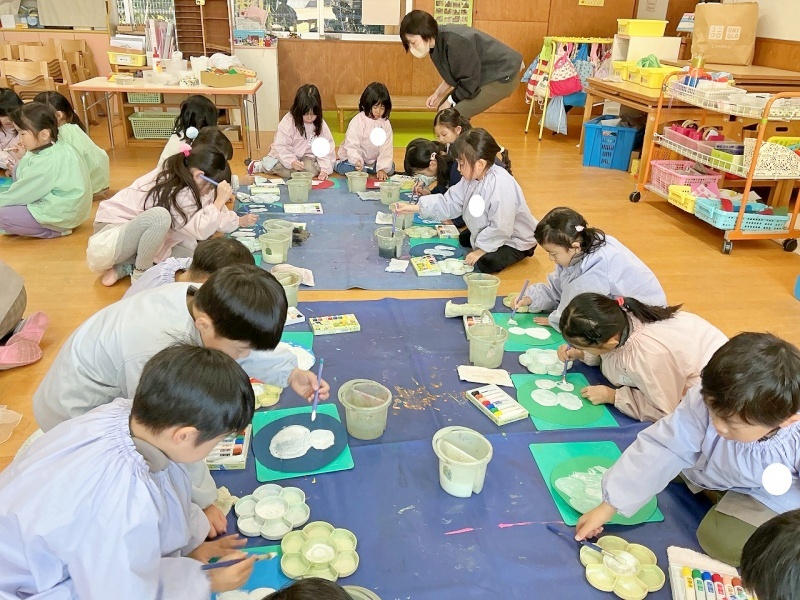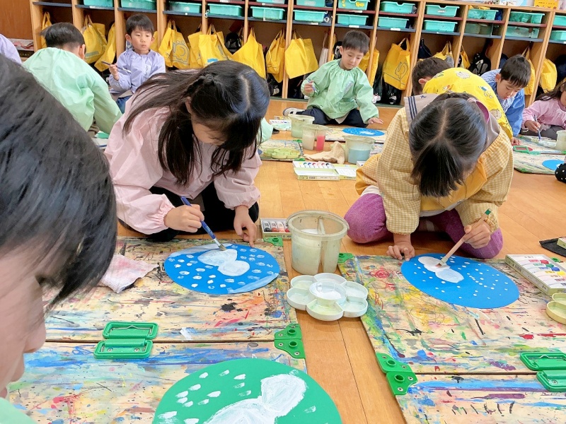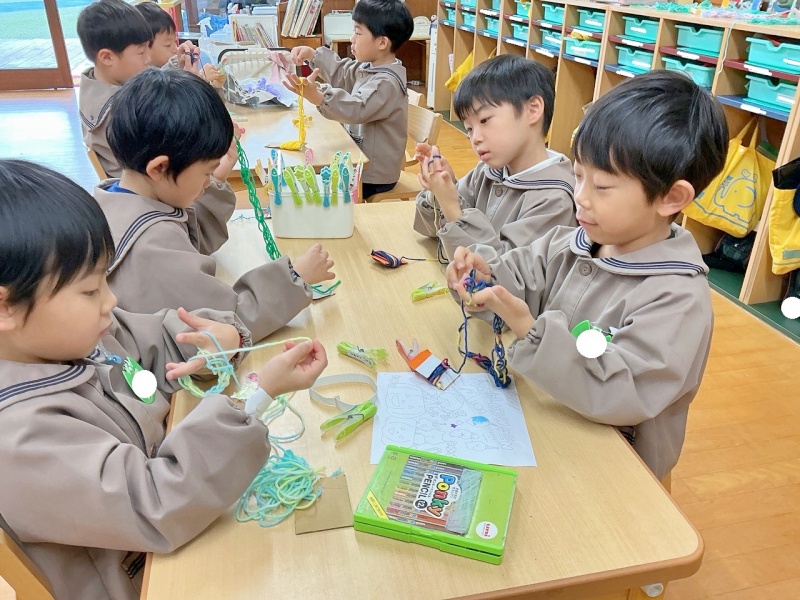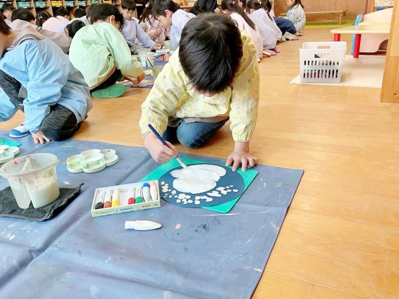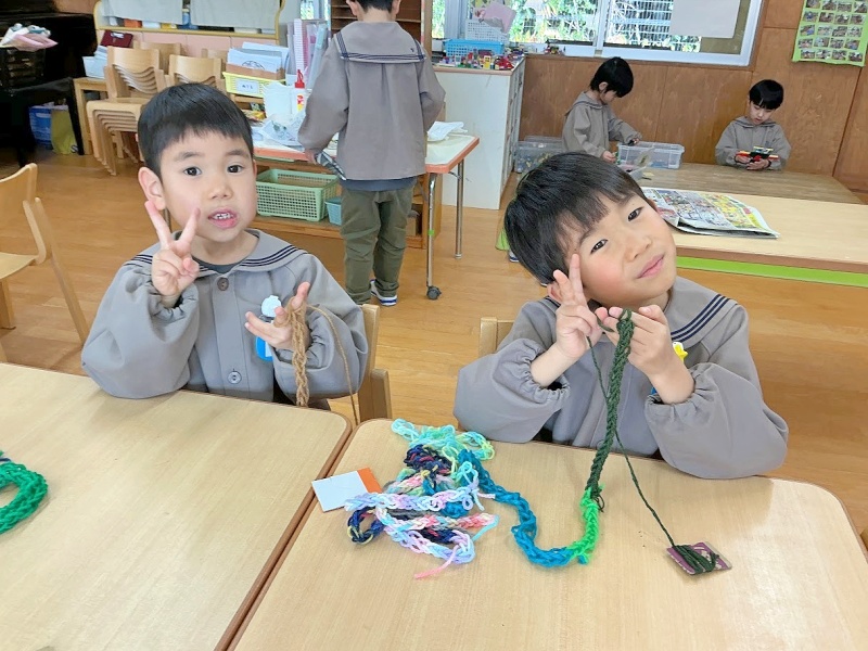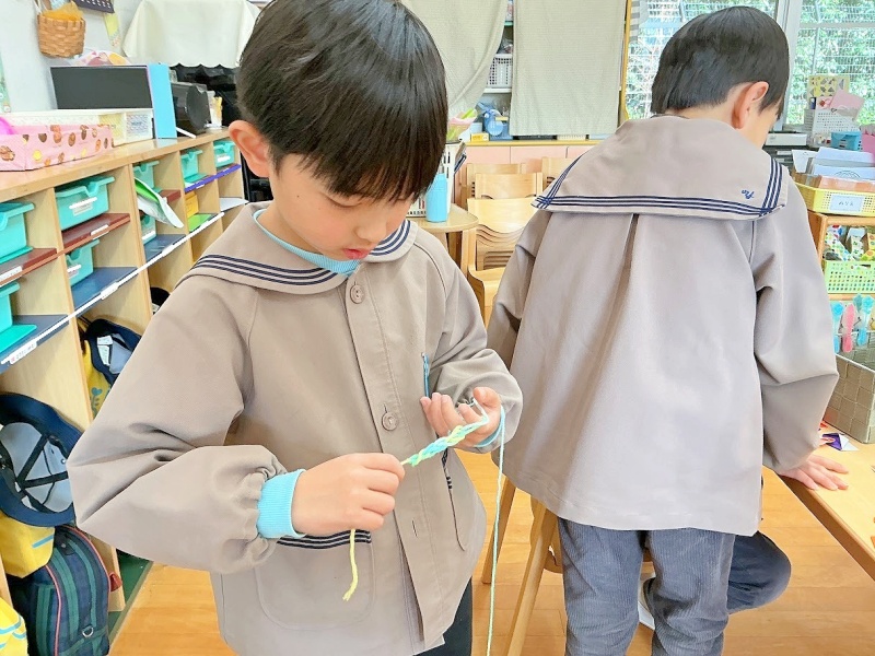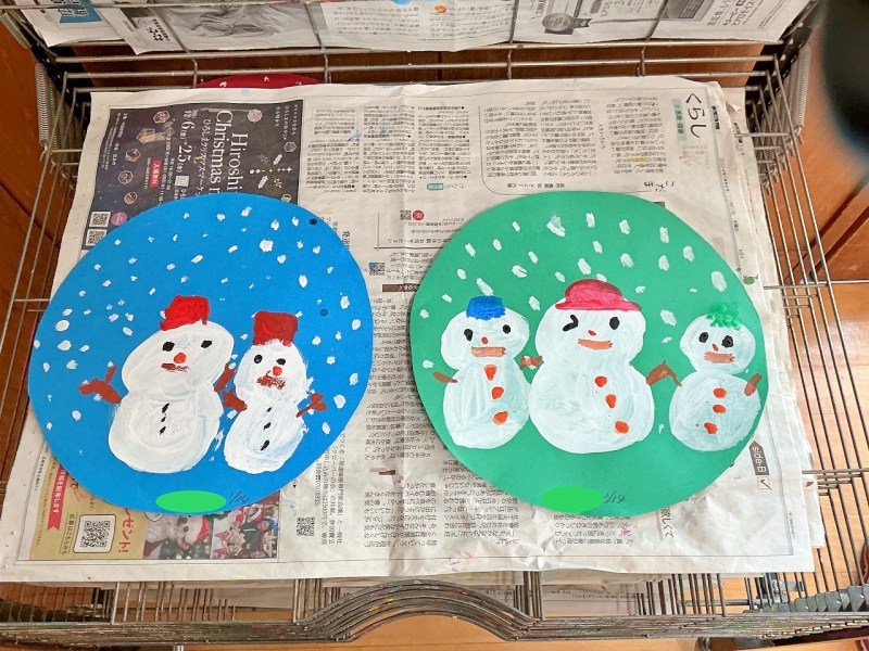 年長組では、毛糸を使って指編みをしました。編み方を覚えると、もくもくと編み、長くなっていくことを楽しんでいました。そして今日は、絵の具で雪ダルマを描きました。