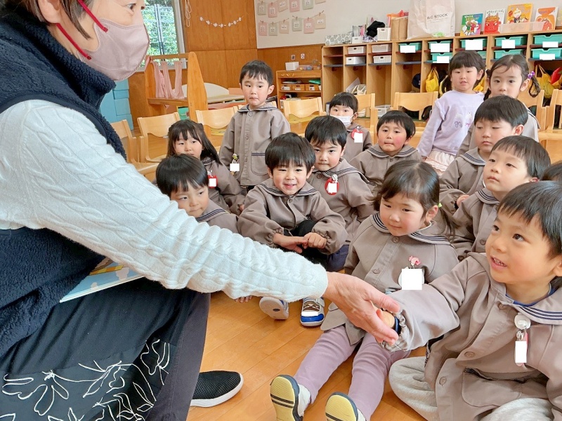 絵本を読んでもらった後、園長先生と手のひらを合わせてお互いの体温を感じたり