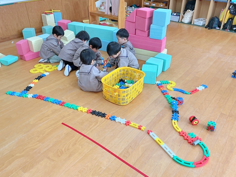 年少組の保育室で、ぎゅーっとかたまって遊ぶ男児たち。