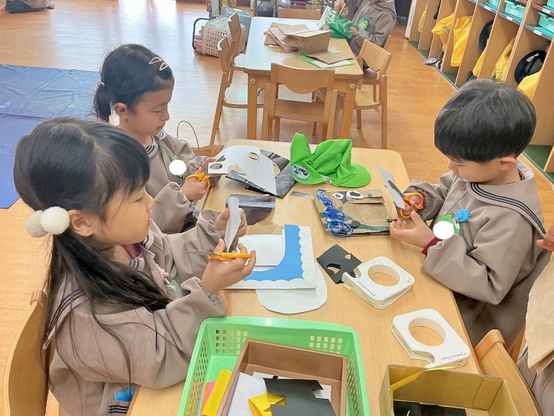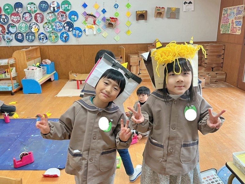 年長組では、紙袋を使って鬼のおめんをつくりました。角や髪など、工夫してつくっていましたよ(*^^*)