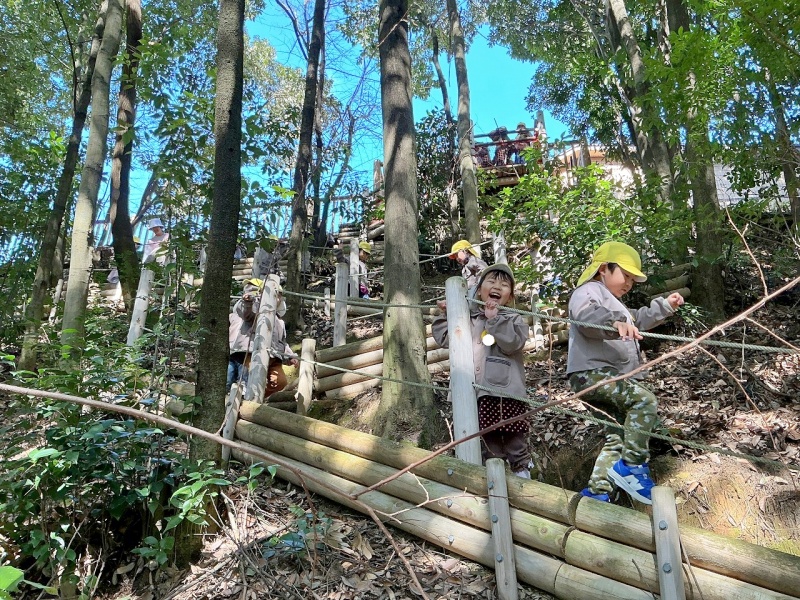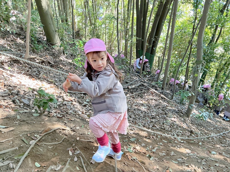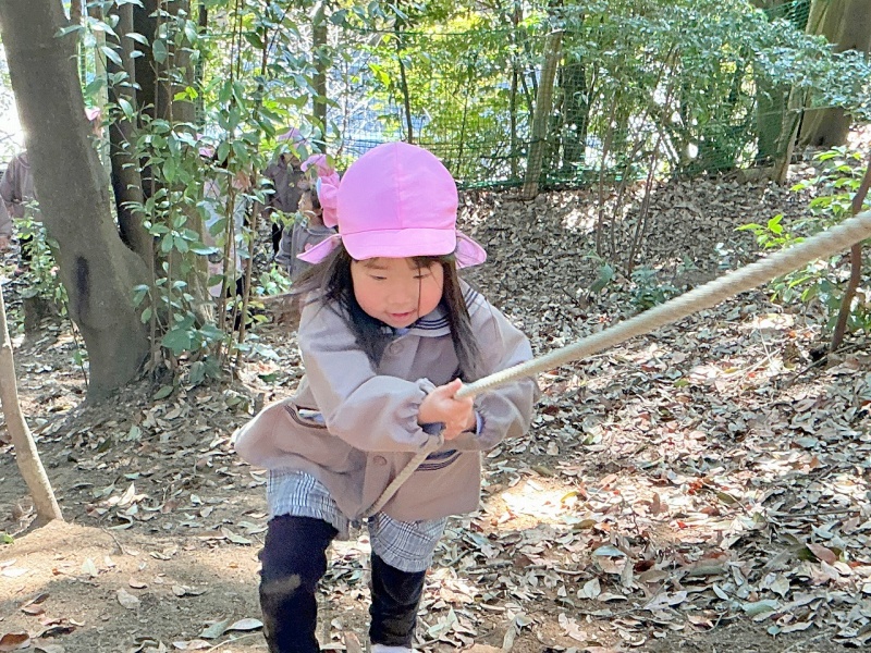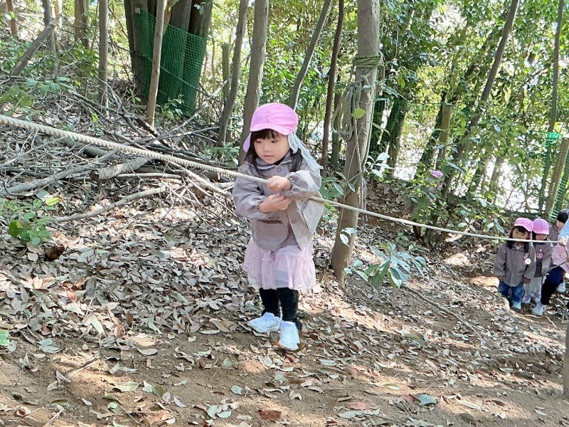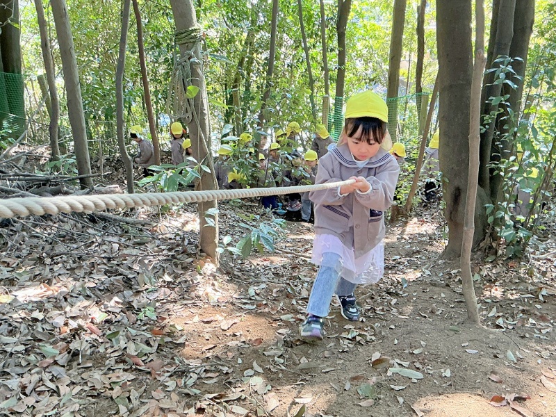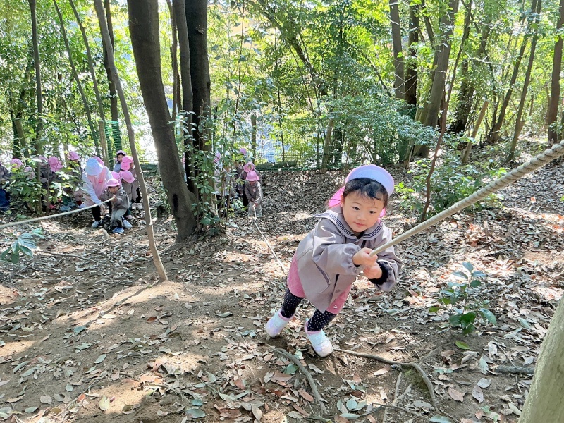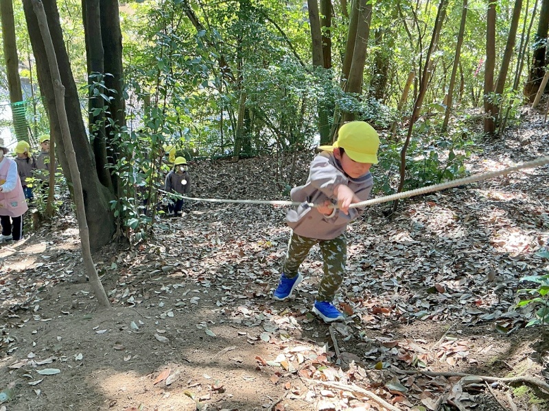年中組は、ひさしぶりにロープのぼりに挑戦しました。スパイダーマンのように木から垂らしたロープを使って登ります。