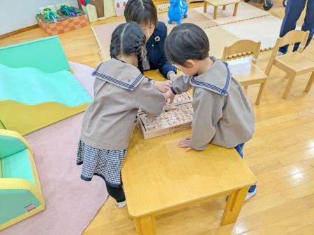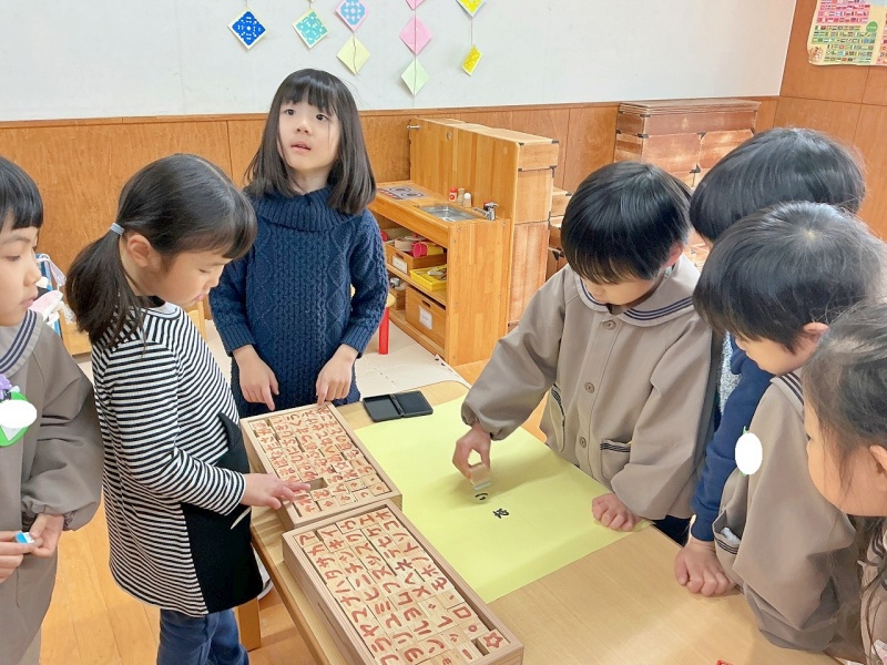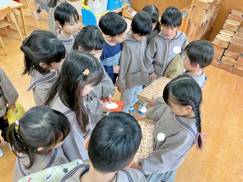 この度、三菱USJ証券の方に文字ハンコをいただきました。年長児が代表して受け取りました。
