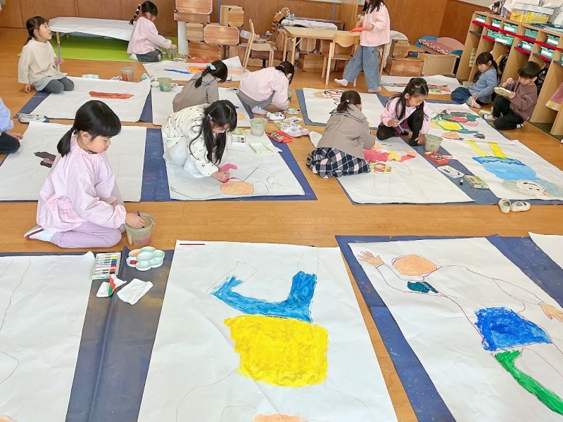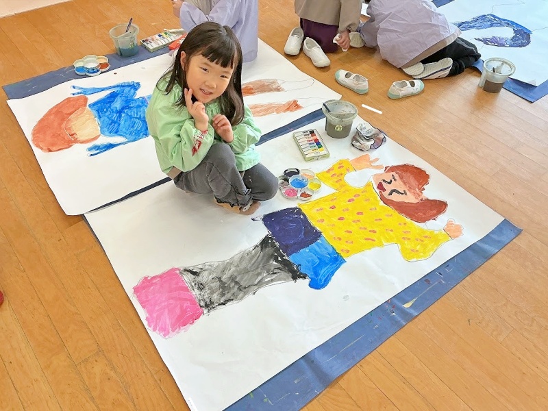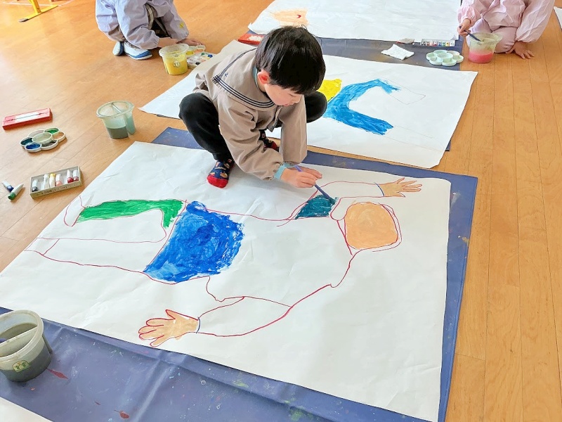 友達と2人1組になって模造紙に寝っ転がり等身大の自分を描きました。