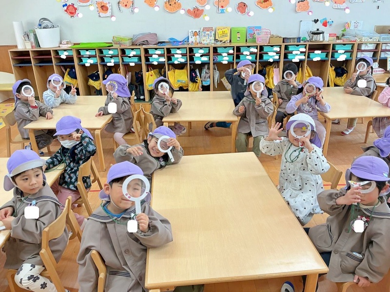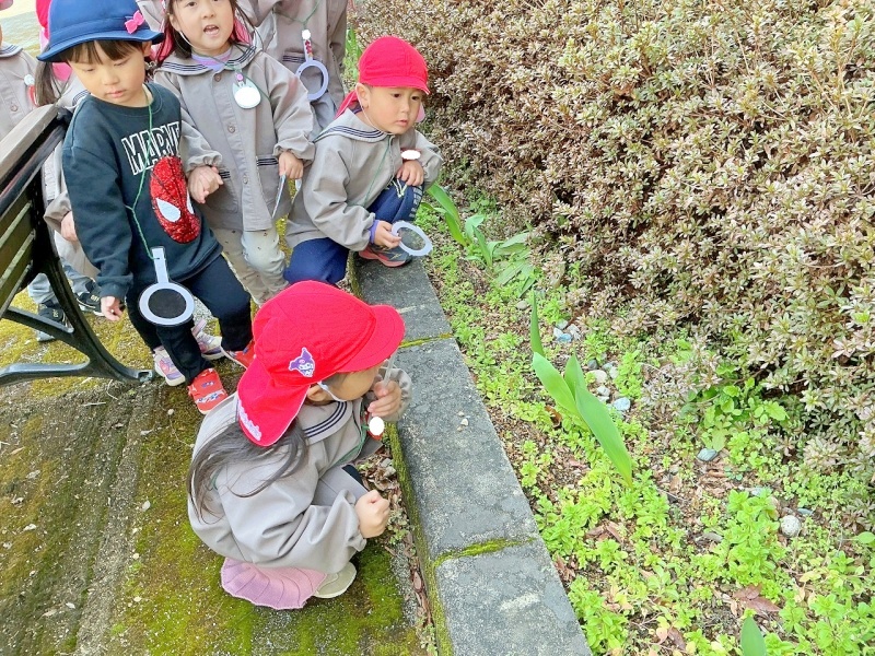 虫眼鏡を通して、梅の花やチューリップの苗など、たくさんの小さな春を見つけました♪