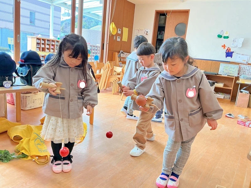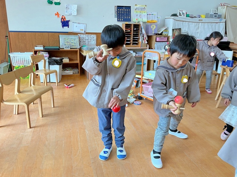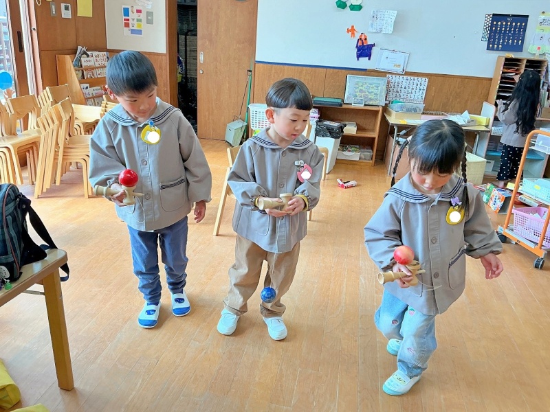 年長組になったら、けん玉教室があります。もうすでに、けん玉をしてみたくて、挑戦しています。