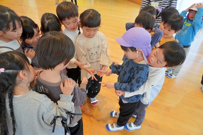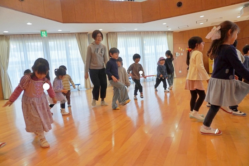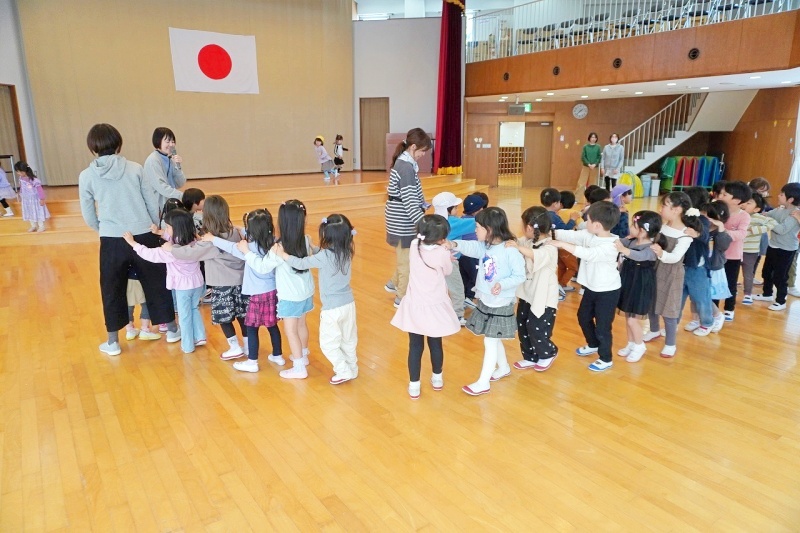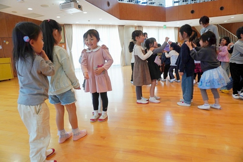 今日の預かり保育でのひとコマです♡異年齢の友達(年中・年長児)と一緒に、リズム遊びをしたりじゃんけん電車をしたりしました。 ぽかぽか陽気が心地よく、戸外遊びも楽しみました★”楽しい”がいっぱいです♡