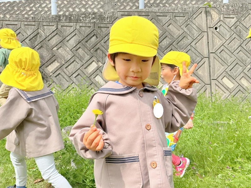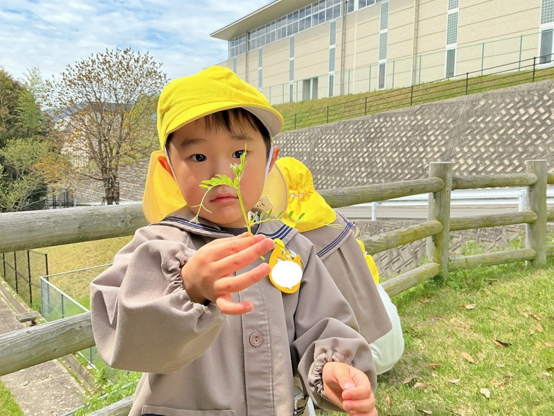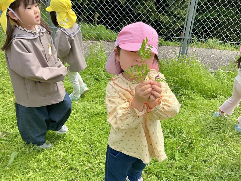 年中組では、芝滑り下にあるアスレチックのところへ散歩に行きました☆カラスノエンドウやスズメノエンドウなどがたくさん咲いており、見つけたり摘んだりして楽しんでいました(^^)☆