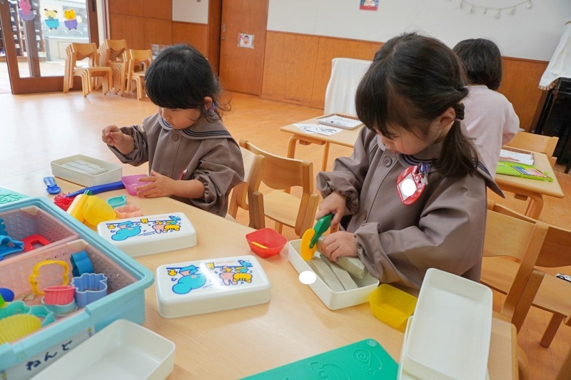 保育室では、やってみたい遊びを見つけて、粘土をしてみたり