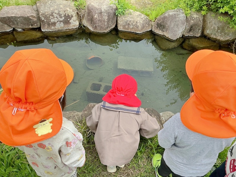ビオトープを覗いて「あっちにあめんぼがおった!」