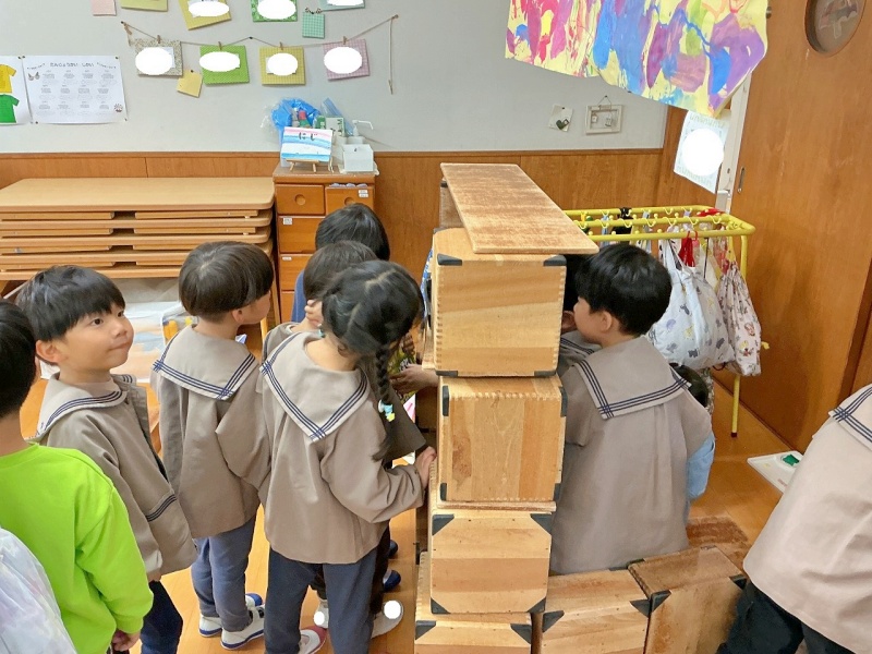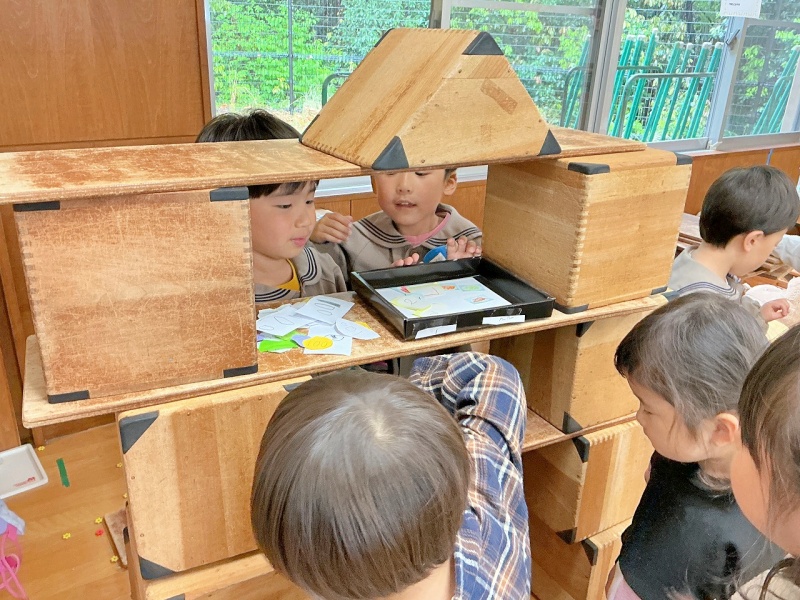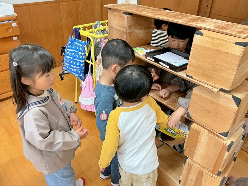 「つきぐみで、くじびきやさんがあります!きてください!」と、宣伝にきてくれたので、画用紙でお金を作って遊びに行かせてもらいました♡ お金を渡すと、くじを引かせてもらい、「2等ですー!」と、景品ももらいました。楽しかったようで、くりかえし楽しんでいました。その後、「わたしもつくってみたいな」と、真似をしながら作り始めていました(^^)また遊びに行かせてね♪