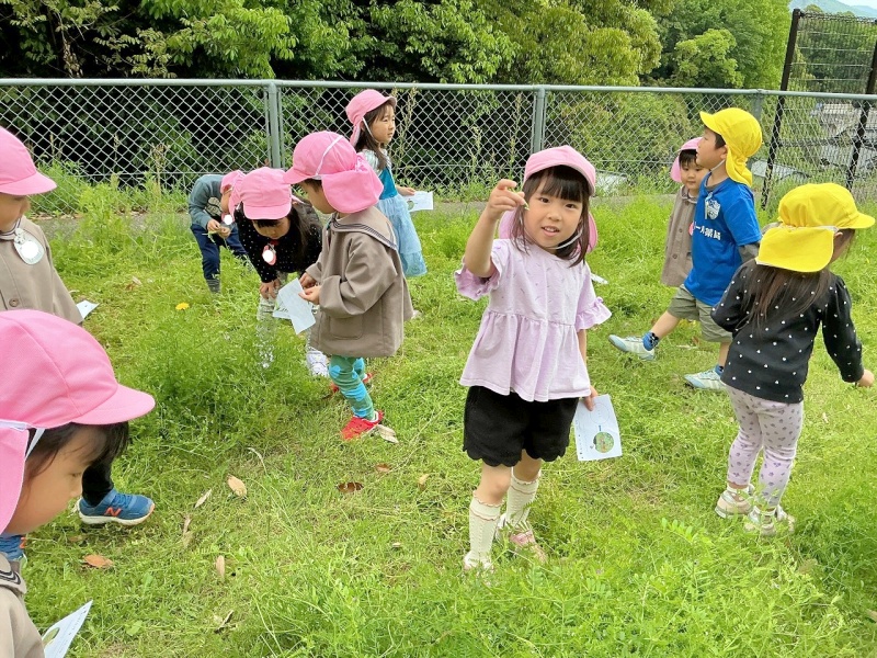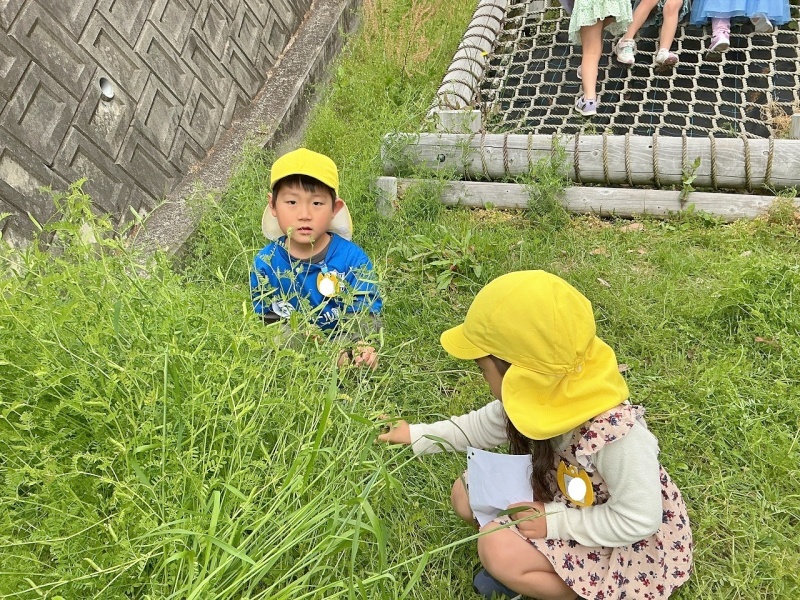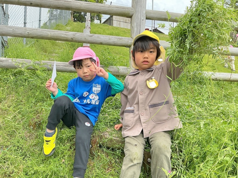 年中組は、今日は芝滑りへ行き、カラスノエンドウの花が何に変身しているか見に行きました。