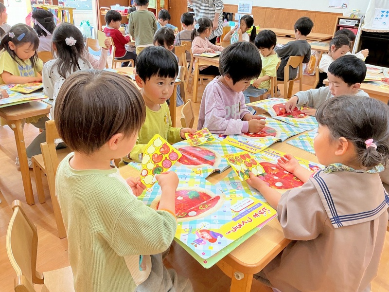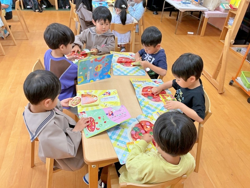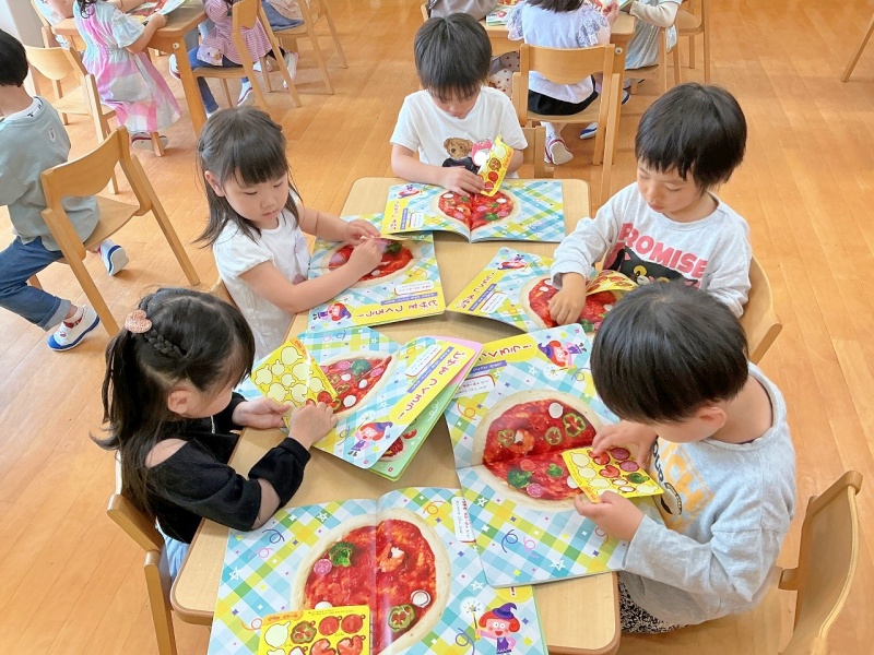 今日みんなで、絵本を見て、絵本についているシールでオリジナルピザを作ったりしました。
