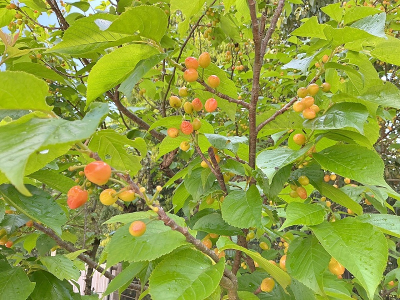 少しずつ赤色になってきていますが、赤くなる前に落ちてしまうさくらんぼもたくさん…。