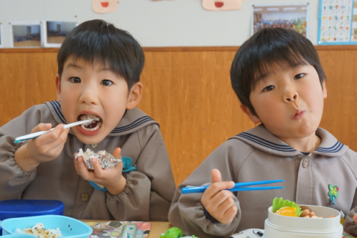 「おいしいよ!」の顔がいっぱい!昔から大事な節目の時、お祝いをする時に「赤飯」を炊いて、祝っていたことを先生から聞き、興味も関心も高まり!グーッ!なかよしペアの友達と一緒に食べたこともいい思い出だね♡