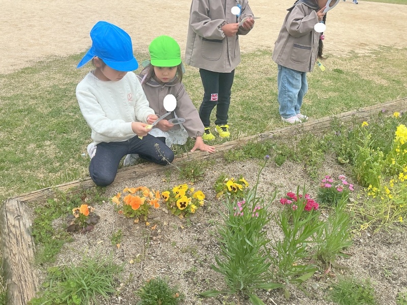 今日は園庭で散歩をしました。 いろいろな色を見つけよう!と手作り虫眼鏡をもって出発!! いろいろなものを見つけていましたよ!! おまけ★ まだまだクラス替えをしたばか…