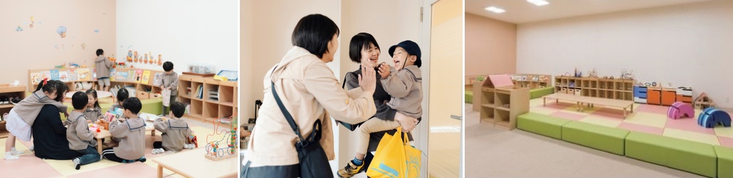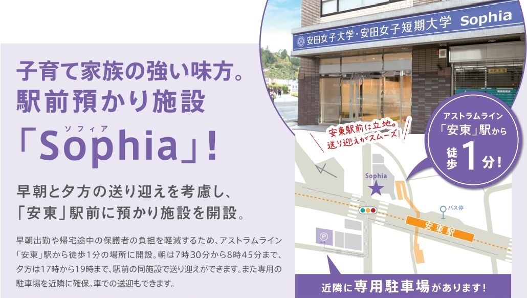朝7:30からの早朝保育や19:00までの延長保育の他、長期休業中の預かり保育も実施しており、仕事を持つ保護者にも優しい支援の充実をはかっています。また、アストラムライン安東駅前に開設した預かり保育施設「Sophia(ソフィア)」を利用することで、通勤や帰宅途中の駅前での預かり保育の利用が可能に。専用の駐車場を近隣に確保、車での送迎も可能です。園内で行う通常の預かり保育と、「Sophia」での駅前預かり保育の併用で、ますます便利になりました。