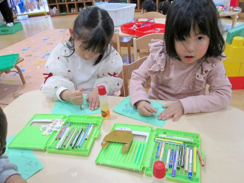 冬休み最終日の預かり保育では、午年の絵馬を作りました! 折り紙で馬を折って、周り…