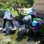 9月末の秋晴れの空の下、年長組が稲刈りをしました。5月に泥田遊びをして田植えをした苗を、農園管理の佐藤先生や山根先生が大切にお世話をしてくださり、幼稚園の園舎下にある田んぼに黄金色の稲が実りました。