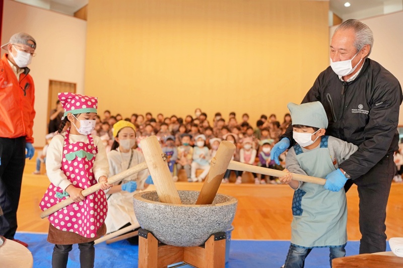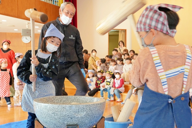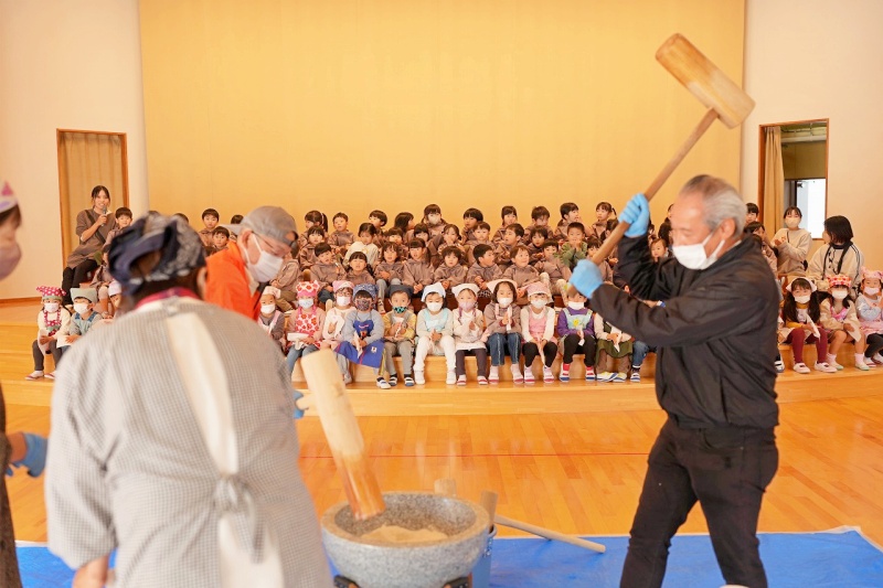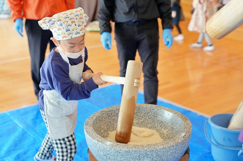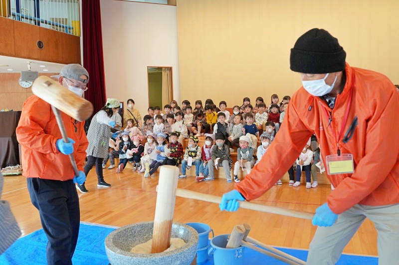 蒸した餅米をバスの先生や子どもたちの力で、ぺったんぺったん!!